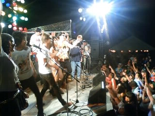 現地スタッフとアキラとのやり取りの手違いで、夜9時と聞いていたのが、実際には夜7時の出番。ドタバタの中で野外ステージへ。野外は10年、いや20年振りぐらいになるか。ユニットバンドのゲストボーカルと言えど、ノンリハで野外ライブは......とやや不安もあった。トラブルは覚悟の上、案の定始まってみれば、ライブの半分ぐらいまではモニターは全く聴こえず。それでもその日一緒だったスタパンやロティカのメンバーをステージに上げたりして、ユニットバンドならではのお祭り状態になり、SCのライブとはまったく違う感じの、レアなステージだった。